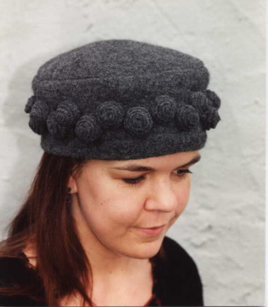 Sehr aufwändiges Modell aus grauem Walkloden / reine Wolle; sämtliche "Schnecken" per Hand angefertigt und aufgenäht; Innenfutter.